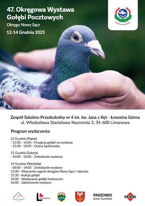 47 Okręgowa Wystawa Gołębi Pocztowych odbędzie się w dniach 12-14 grudnia 2025 w Szkole Podstawowej w Łososinie Górnej.Organizatorem z ramienia Okręgu jest oddział Limanowa 1.